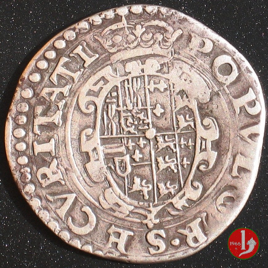 3 Cavalli 1° tipo Dritto: PHILIPP III D G REX ARA VT SI, Pietra focaia circondata da quattro acciarini e quattro fiamme. Verso: IN HOC SIGNO VINCES, Croce di Gerusalemme cantonata da crocette simili. | |