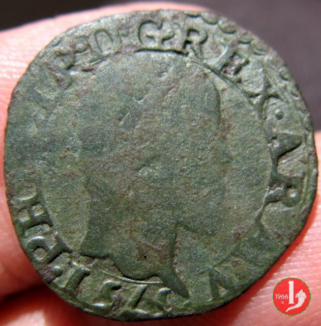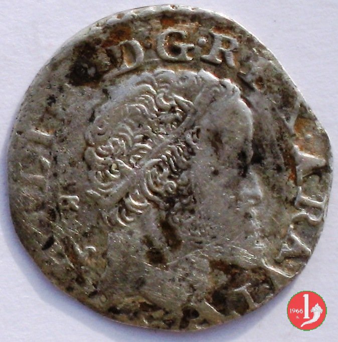 Tornese con testa a sx Dritto: PHILIPP D G REX ARA VTR SIC, Testa radiata del Re volta a sx, davanti al collo testina di Medusa. Sigle diversamente disposte. Verso: PVBLICE COMMODITATI, Cornucopia con frutta e spighe volta a sx, ai lati la data divisa in due parti dalla cornucopia. | |