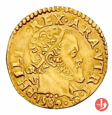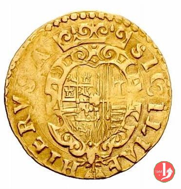Scudo d'oro a testa nuda Dritto: PHILIPP • REX • ARAGO • VTR, Testa del Re nuda volta a dx, dietro monogrammi IBR/VP, sotto fiore. Verso: SICIL • ET HIERVS A, Stemma coronato ellittico, inquartato con le armi di Leon e Castiglia, Aragona e Gerusalemme, Paesi Bassi e Sicilia | |