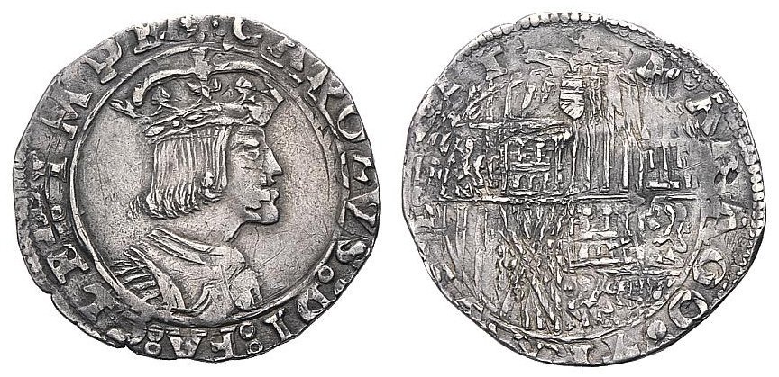 Tarí con busto laureato 1° tipo Dritto: CAROLVS • IIIII (o V) • ROM • IM, Busto laureato volto a dx, dietro sigla. Verso: R HISPA V TRIVR SI, Stemma inquartato coronato su aquila bicipite, fra le due teste corona. | |