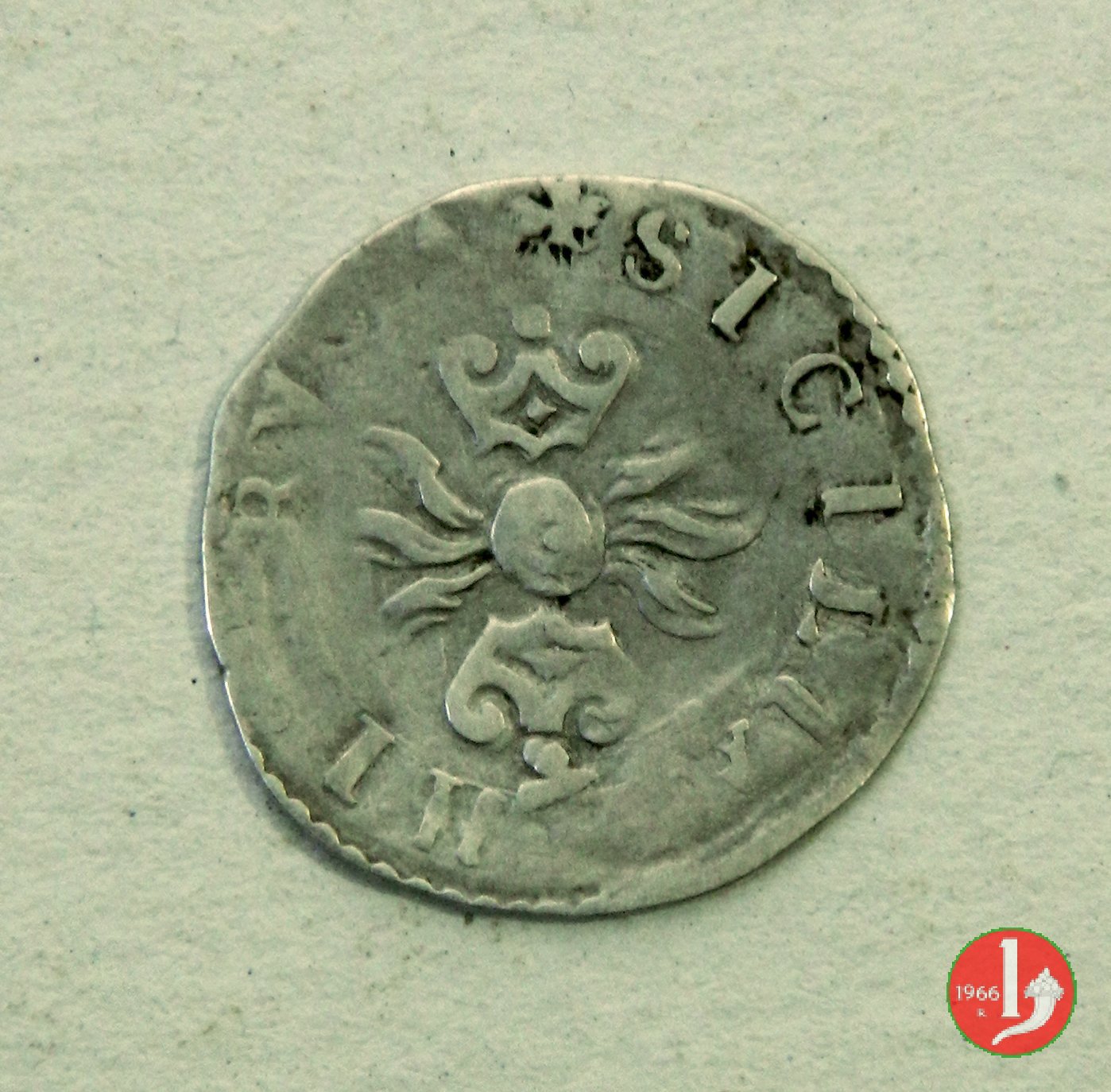 Tarí con il busto del Re a testa radiata Dritto: PHILIPP • DEI • GR • REX • AR • VTR •, Busto del Re con corona radiata volto a dx, dietro la testa sigle, sotto la data. Verso: SICILIAE • ET HIERVSAL, Stemma coronato a forma di cuore. | |