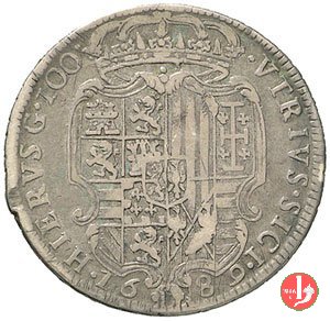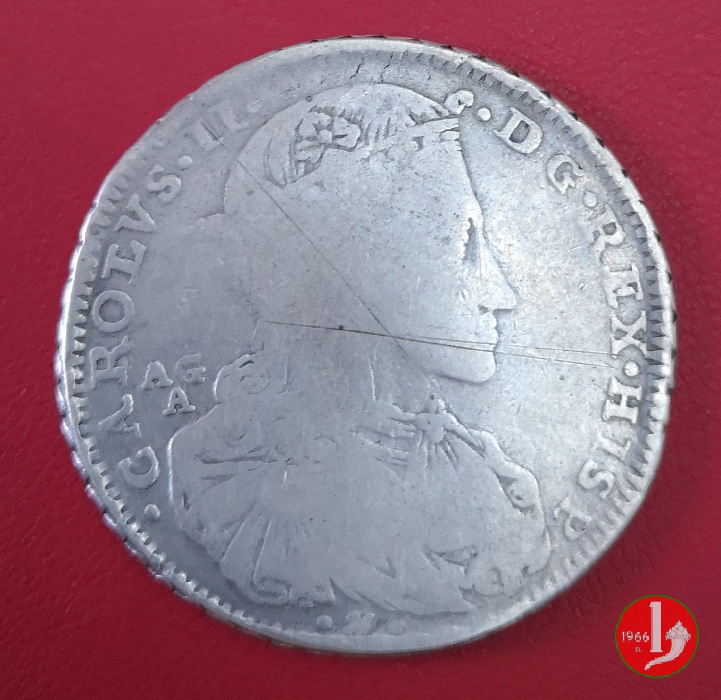 8 Grana Dritto: • CAROLVS • II • D • G • REX • HISP •, Busto del Re a testa nuda volto a dx, dietro AG/A, sotto •IM. Verso: • IN HOC • SIGNO • VINCES • G • VIII • e la data, croce cantonata da raggi. | |
