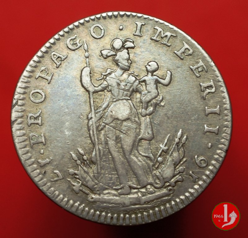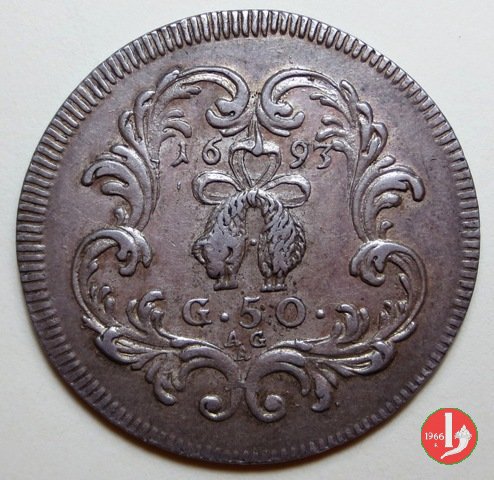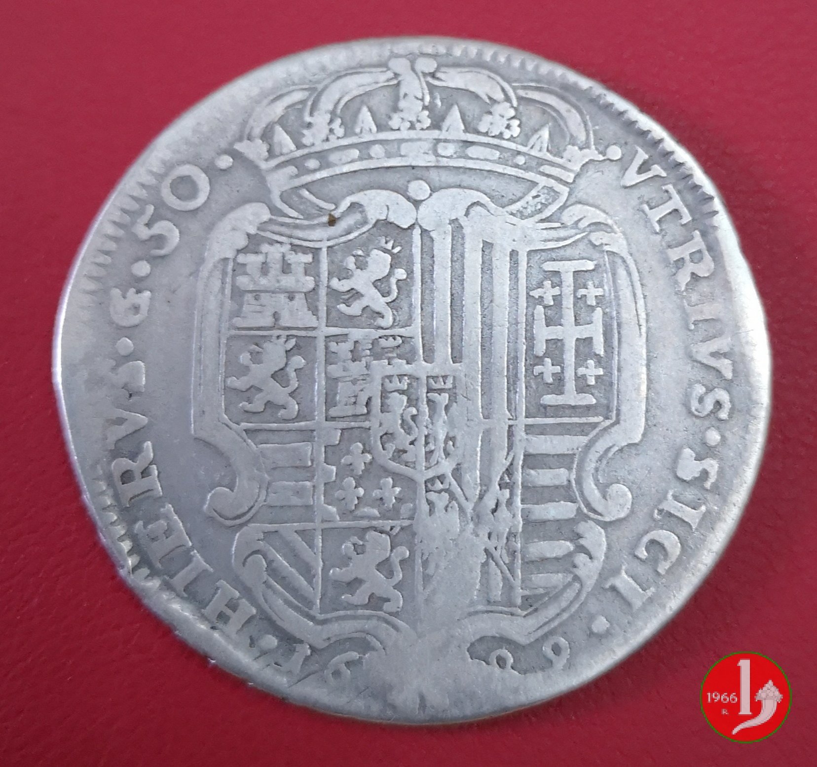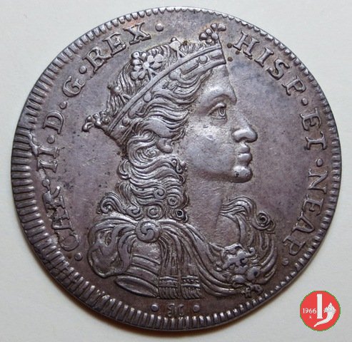 Mezzo ducato con Tosone Dritto: . CAR • II • D.G • REX • HISP • ET • NEAP • Busto coronato del re a dx, sotto •IM.. Verso: Data divisa in due dal nastro che sorregge il tosone, Tosone volto a sx, sotto G •50 piú in basso AG/A, tutto in cartella ornata. | |