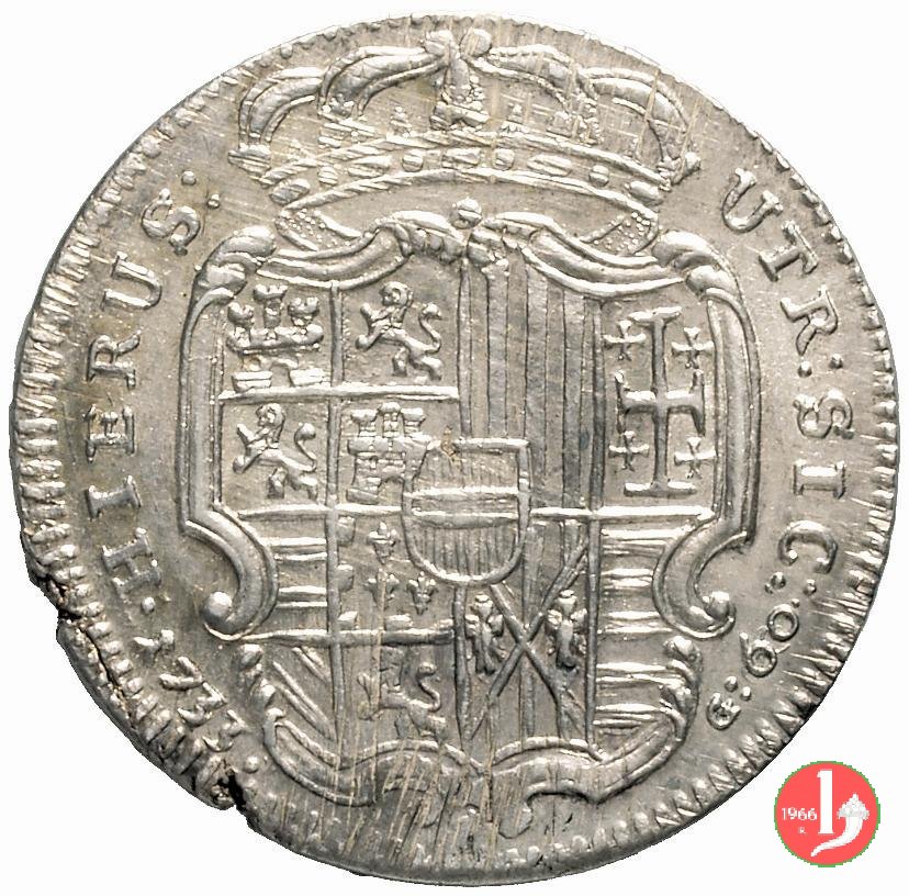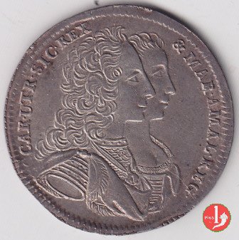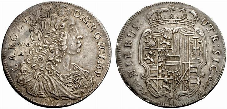 Mezzo ducato Dritto: • CAR • VI • D G • • ROM • IMPE •, Busto dell'imperatore a dx, nel taglio del braccio IM. Verso: • HISP • VTRI • • SICI • REX •, Stemma coronato in cartocci ornato con parte del collare del Toson d'oro , a sx della corona sigle zecchieri, sotto la data. | |