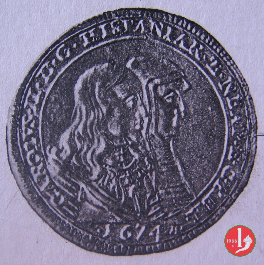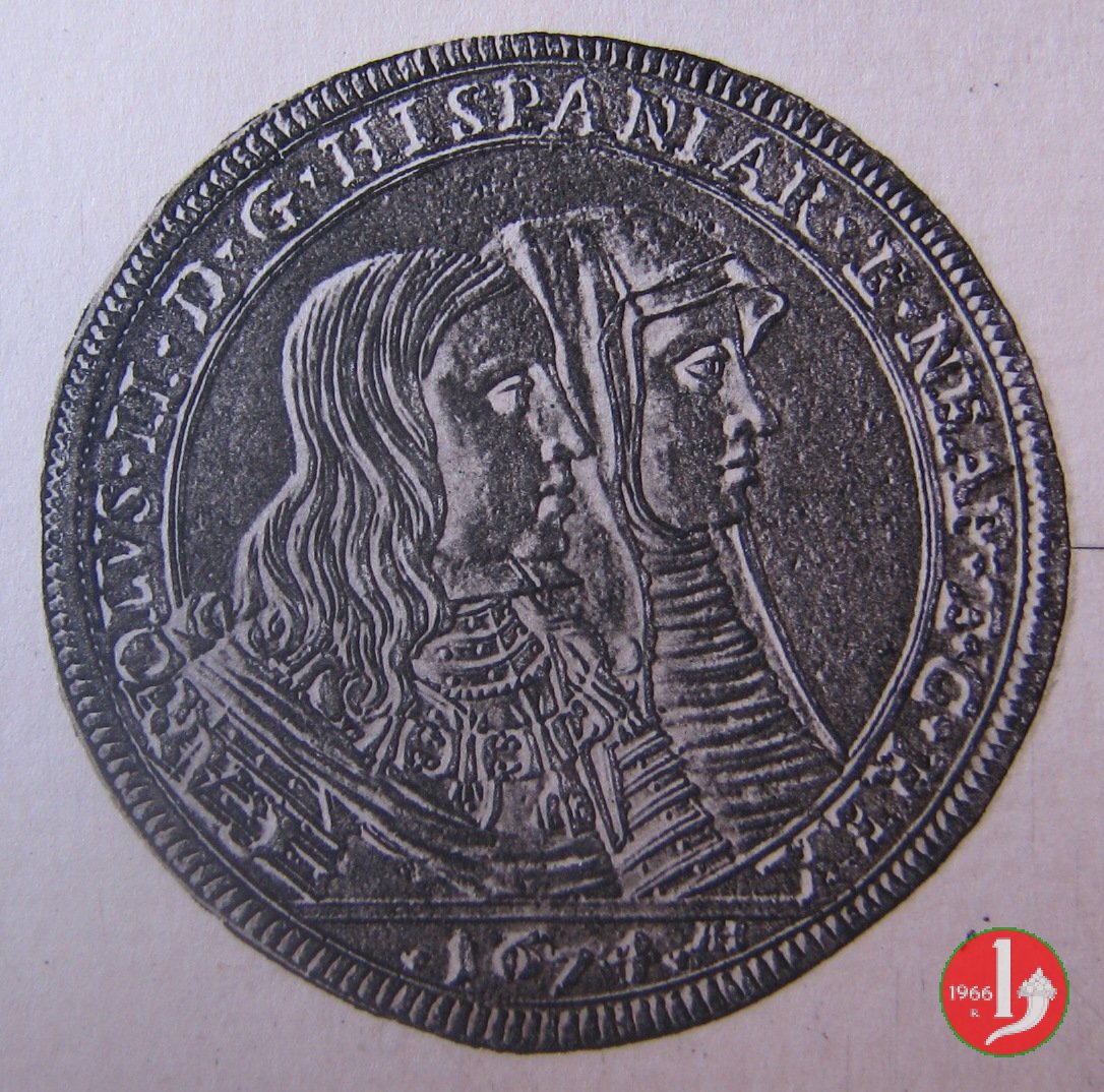 Ducato Dritto: .CAROLVS • II • D • G • HISPANIAR • ET • NEAP • ET • C • REX • Busti del Re Carlo e della Regina Maria Anna volti a dx in doppio cerchio; all'esergo 1674 • AH, contorno dentellato. Verso: . ET • MARIAN • EIVS • • MATER • REGNI • GVB • , stemma coronato in doppio cerchio • Contorno dentellato. | |