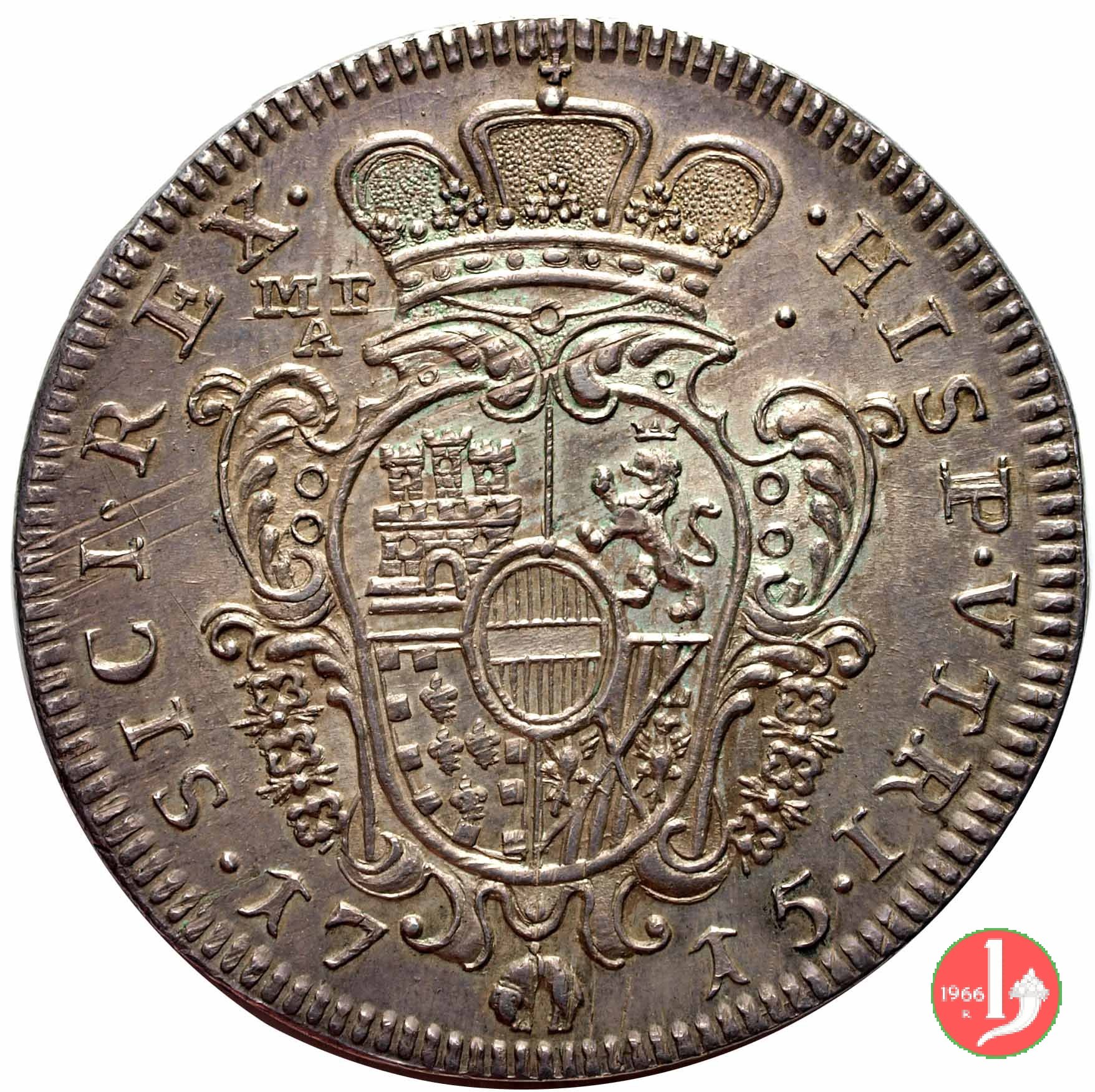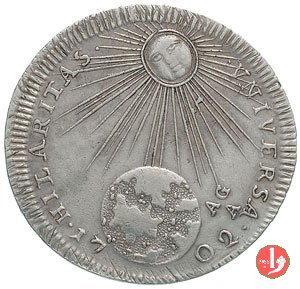 Mezzo ducato Dritto: • PHILIP • V • D • G • • REX • HISP • E • NEAP •, Busto del Re a dx, sotto •I.M. Verso: • HILARITAS • VNIVERSA •, Globo terrestre illuminato dal sole, a dx AG/A, sotto la data. | |