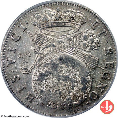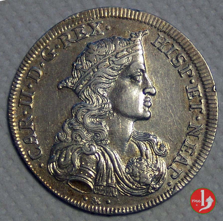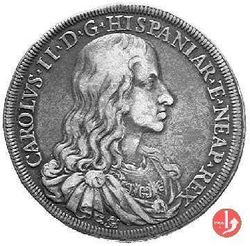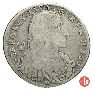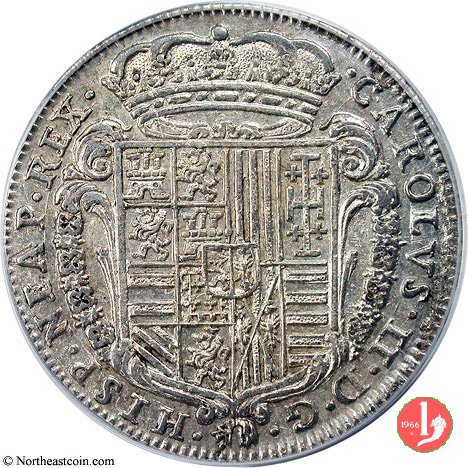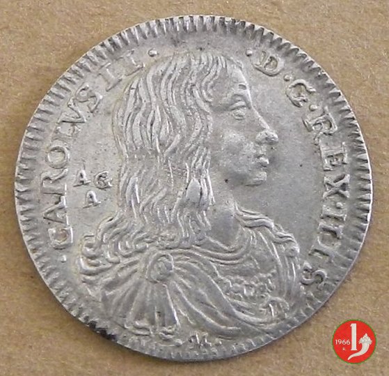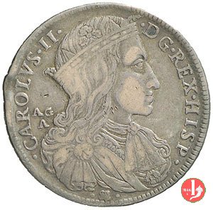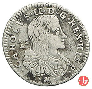 Carlino con stemma Dritto: •CAROLVS • II • D • G • REX • HISP, Busto del Re a testa nuda volto a dx, dietro AG/A, sotto IM. Verso: •VTRIVS • SIC • • HIERVS • G • X • Stemma coronato, sotto la data (per la prima volta su una moneta dargento napoletana è segnato il valore G.X.) | |