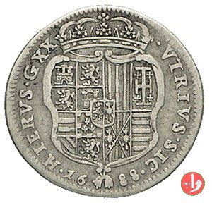 Mezzo ducato con lo Stemma Dritto: •CAROLVS • II • • DG • REX • HISP • Busto coronato volto a dx, dietro AG/A, sotto •IM. Verso: • VTRIVS • SICI. • HIERVS • G • 50 Stemma coronato, sotto 16 89. Contorno dentellato. | |