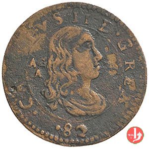 9 Cavalli Dritto: CAROLVS.II.D.G.REX., Busto del Re volto a dx in cerchio lineare, dietro AG/A, sotto •83. contorno di perline. Verso: Croce greca scannellata, con estremità fiorite, cantonata da gigli, in cerchio lineare; il tutto in cerchio di foglie, contorno di perline. | |