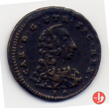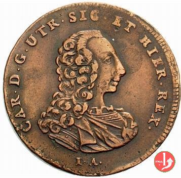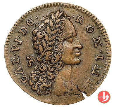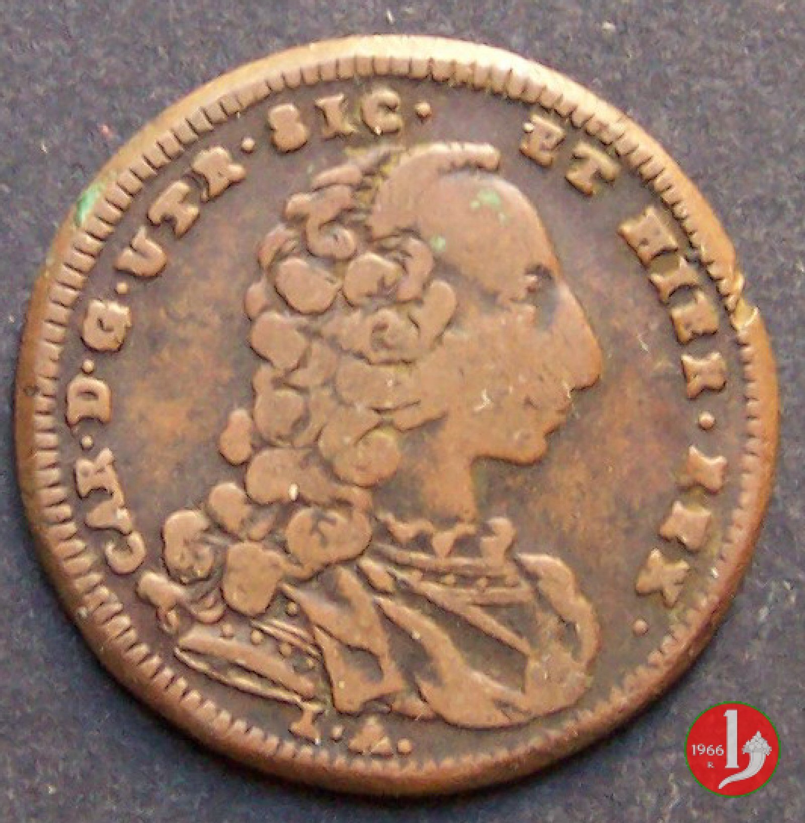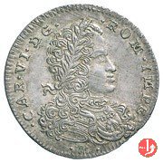 Tornese Dritto: CAR VI D G ROM IMP, Testa laureata dellimperatore a dx. Verso: HIS VTRI SICI REX, Stemma coronato in collare dell'ordine del Toson d'oro, sotto la data 1714. | |