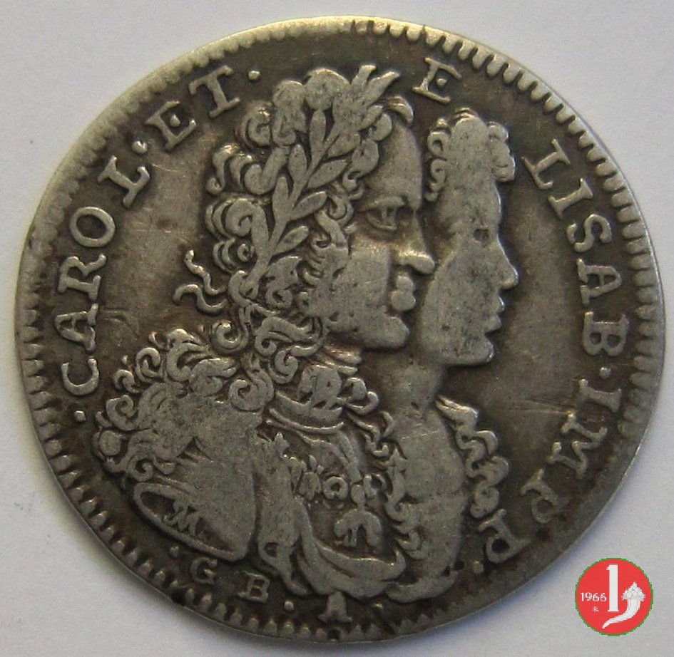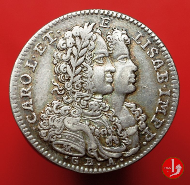 Carlino 2° tipo Dritto: CAROL ET ELISAB IMPP, Busti accollati di Carlo VI e di Elisabetta volti a dx, nel taglio del braccio IM, sotto GBA. Verso: PROPAGO IMPERII, Figura femminile con lancia nella mano dx ed a sx un bambino, su armi e bandiere, in basso la data. | |