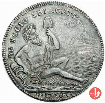 1/2 Piastra con Sebeto Dritto: DE SOCIO PRINCEPS, Il Sebeto sdraiato con il Vesuvio fumante sullo sfondo, in esergo data e sigle. Verso: CAR D G REX NEAP HISP INFANS &c, stemma coronato con ai lati le sigle, in basso il valore G.60 racchiuso in ovale lineare. | |