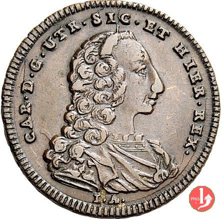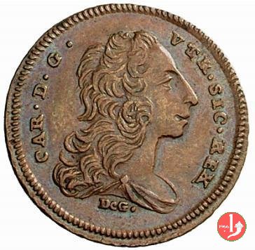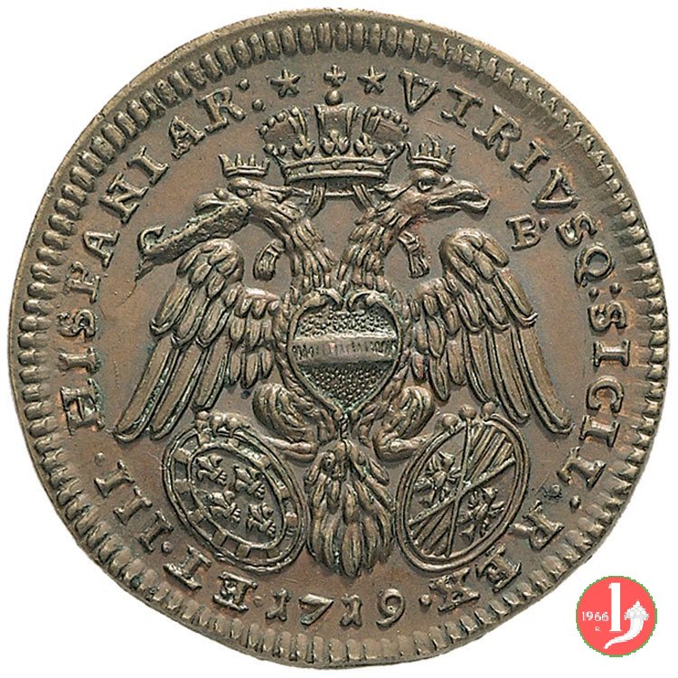 Grano Dritto: CAR: VI.D: G: ROM: IMP: S: A:, Busto laureato dellimperatore a dx. Verso: .ET. III. HISPANIAR: VTRIVSQ: SICIL: REX., Aquila bicipite con le due teste coronate, tra le teste corona Imperiale, nel petto stemma austriaco e nelle zampe stemma di Napoli e Sicilia. A sx G., a dx B., sotto la data 1719. | |