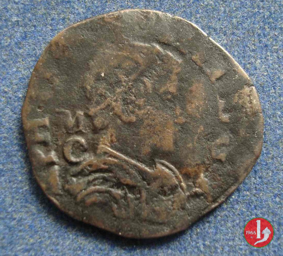Tornese Dritto: HEN ^ DE ^ LOR ^ DVX ^ REI ^ N^, Scudo coronato contenente in una fascia SPQN. Verso: ^LETIFICAT ^ 1648 ^, Grappolo duva, a sx GA/C, a dx sigla del coniatore. | |