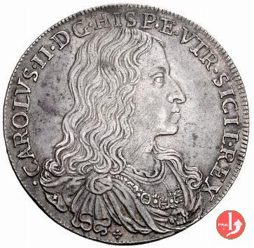 Mezzo ducato con la Vittoria Dritto: •CAROLVS • II • D • G • HISP • ET • VTR • SICIL • REX • Busto del Re volto a dx, sotto il busto una croce. Verso: RELIGIONE • ET • GLADIO • e la data, La Vittoria seduta a dx che sorregge con la mano dx uno scudo a stemma ripartito e nella mano sx un ramo, sigle AG/A. | |