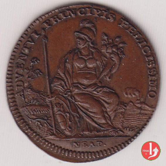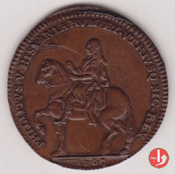 Moneta-medaglia in rame Dritto: PHILIPPVS V HISPANIARVM ET VTRIVSQ SIC REX, il re a cavallo volto a sx, sotto 1702. Verso: ADVENTVI PRINCIPIS FELICISSIMO, Partenope galeata seduta, in basso stemma di Napoli, in fondo il Vesuvio. In esergo NEAP. | |