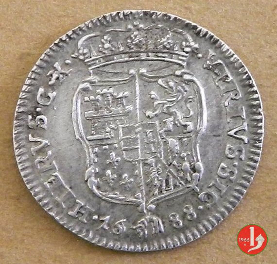 Tornese Dritto: CAR D G VTR SIC ET HIER REX, Volto del Re a Dx, sotto sigle. Verso: HILA / RI / TAS in cartella ornata, ai lati le sigle M M, sotto la data. | |