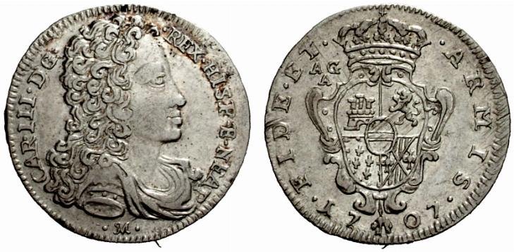 Carlino Dritto: CAR III D G REX HISP ET NEAP, Busto del Re a dx, sotto IM • Verso: FIDE ET ARMIS, Stemma coronato, a sx AG/A, sotto la data 1707. | |