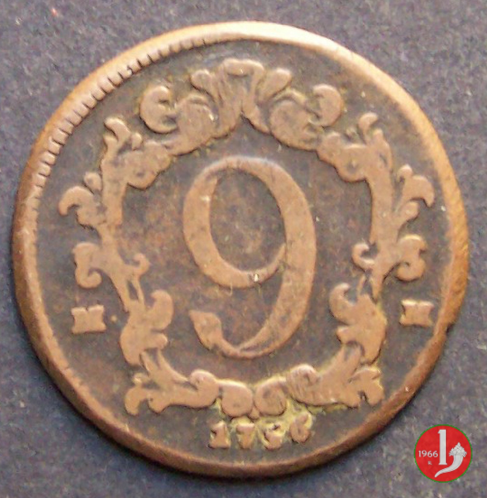 9 Cavalli Dritto: CAR D G UTR SIC ET HIER REX, Busto del Re a Dx, sotto le sigle I.A. Verso: Grande 9 indicante il valore in cartella ornata, ai lati la sigla MM, sotto la data. | |