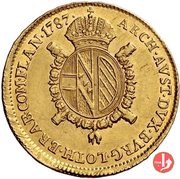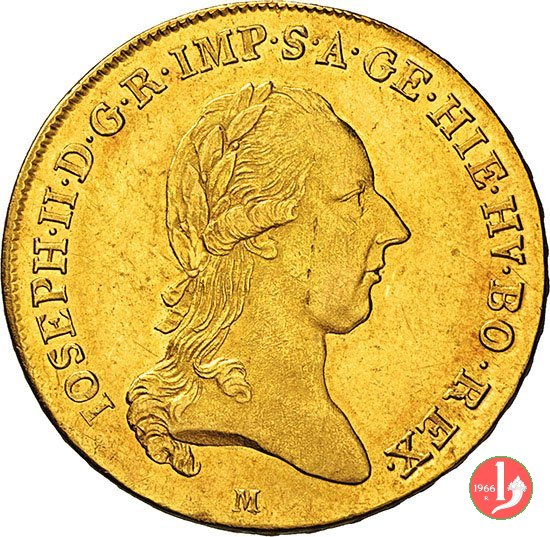 Mezzo sovrano Dritto: Semibusto con testa laureata, a destra; attorno IOSEPH II • D • G • R • IMP • S • A • GE • HIE • HV • BO • REX • ; sotto il segno "M" della zecca di Milano Verso: Stemma di formato ovale, coronato, su croce di Borgogna, fregiata del Toson d'oro; attorno: ARCH • AUST • DVX • BVRG • LOTH • BRAB • COM • FLAN • e la data | |