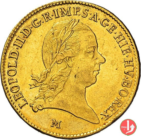 1 sovrano Dritto: Stemma ovale degli Asburgo-Lorena sormontato da corona imperiale e ornato dal collare del Toson d'Oro. Intorno, ARCH • AVST • DVX • BVRG • LOTH • BRAB • COM • FLAN • e il millesimo. Verso: Semibusto laureato dell'Imperatore a destra, intorno LEOPOlD • II • D • G • R • IMP • S • A • GE • HIE • HV • BO • REX •. In esergo il segno di zecca (M). | |
