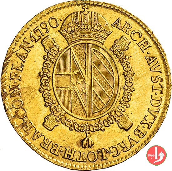 1 sovrano Dritto: Stemma ovale degli Asburgo-Lorena sormontato da corona imperiale e ornato dal collare del Toson d'Oro. Intorno, ARCH • AVST • DVX • BVRG • LOTH • BRAB • COM • FLAN • e il millesimo. Verso: Testa dell'Imperatore con corona di alloro a destra, intorno FRANC • II • D • G • R • IMP • S • A • GE • HIE • HV • BO • REX •. In esergo il segno di zecca (M). | |
