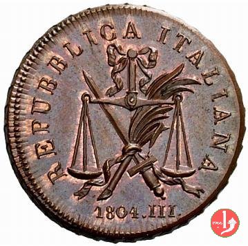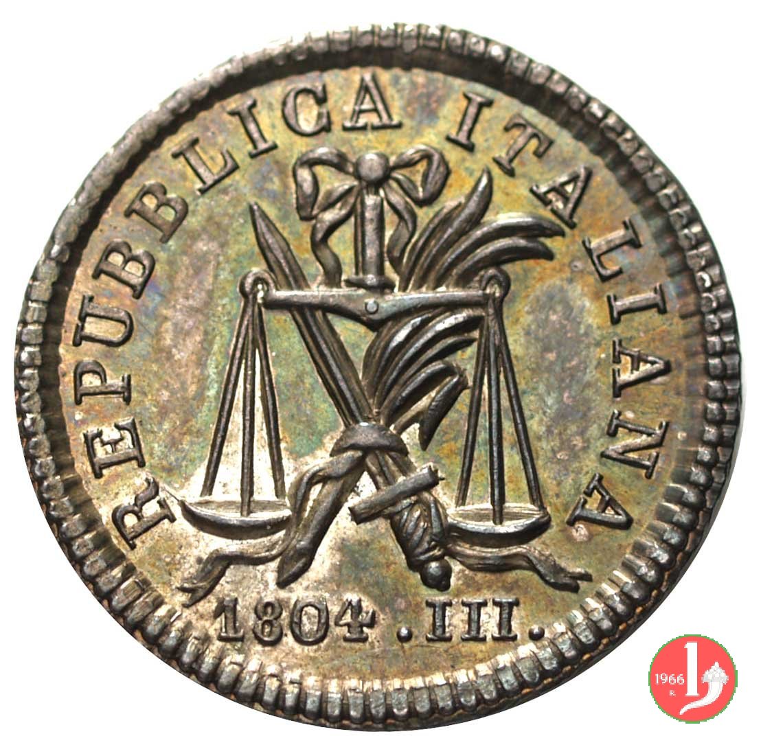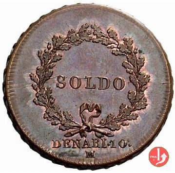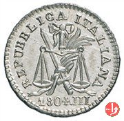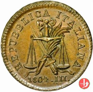 1 soldo Dritto: Bilancia a due bracci sovrapposta ad un ramo di palma e spada che si incrociano legati da un nastro, intorno REPUBBLICA ITALIANA. In basso indicazione del millesimo (1804 • III •). Verso: Indicazione del valore (SOLDO) all'interno di due rami di quercia incrociati e legati con un nastro. In esergo indicazione del valore (DENARI 10 •) sotto al quale si trova il segno di zecca (M). | |
