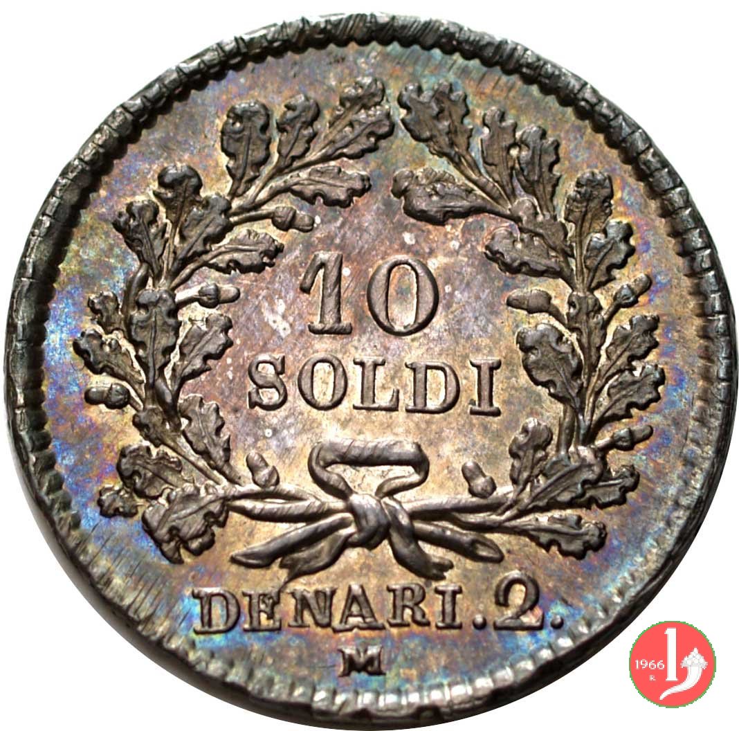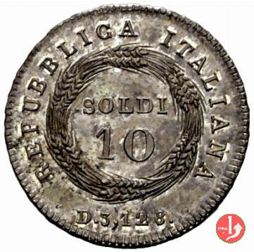 10 Soldi Dritto: Bilancia a due bracci sovrapposta ad un ramo di palma e spada che si incrociano legati da un nastro. Nel giro REPUBBLICA ITALIANA. All'esergo 1804 • III • (indicazione del millesimo ). Verso: Tra due rami di quercia incrociati e legati con un nastro, su due righe 10/SOLDI All'esergo DENARI • 2 • (indicazione del peso)/ M (segno di zecca per Milano) | |