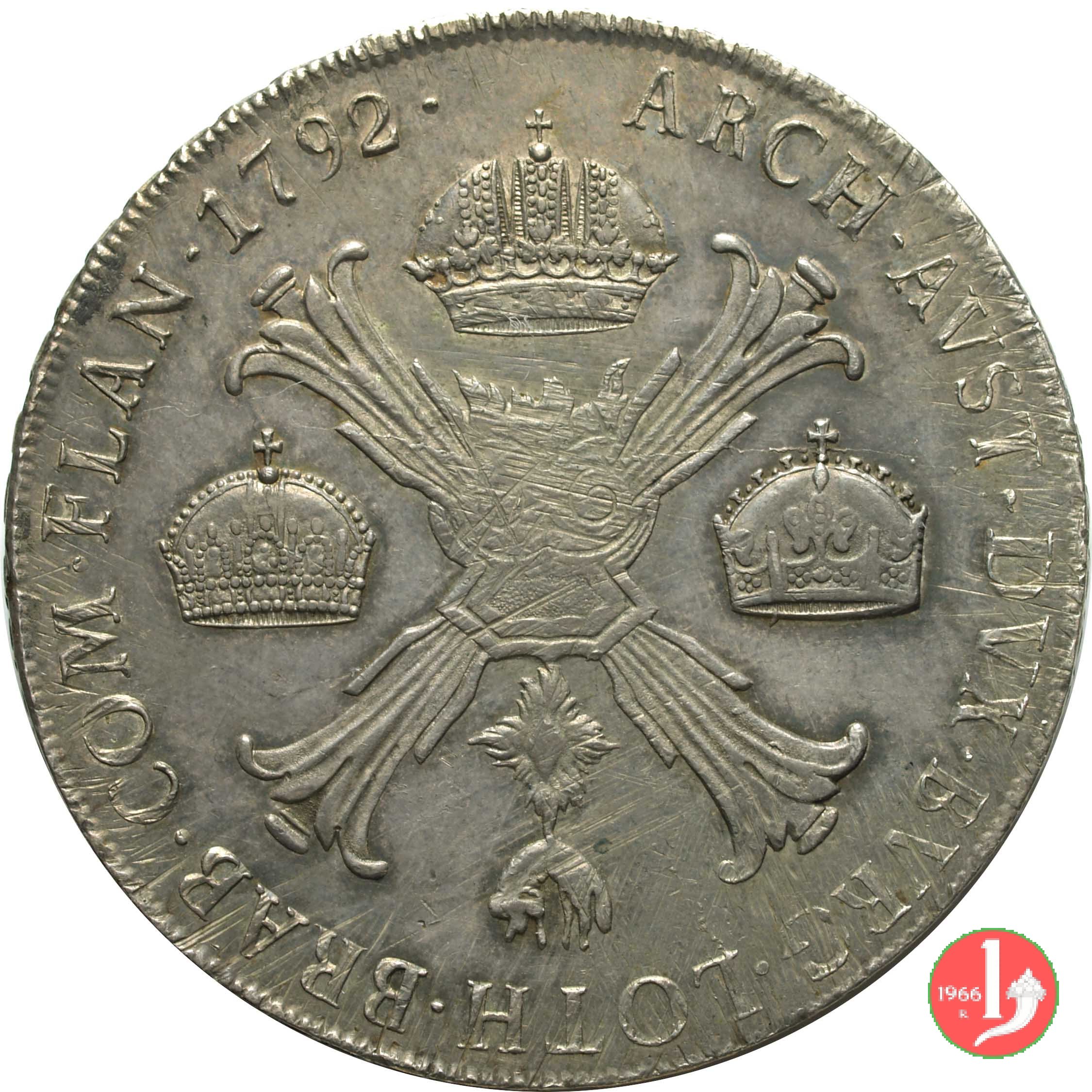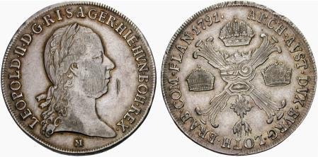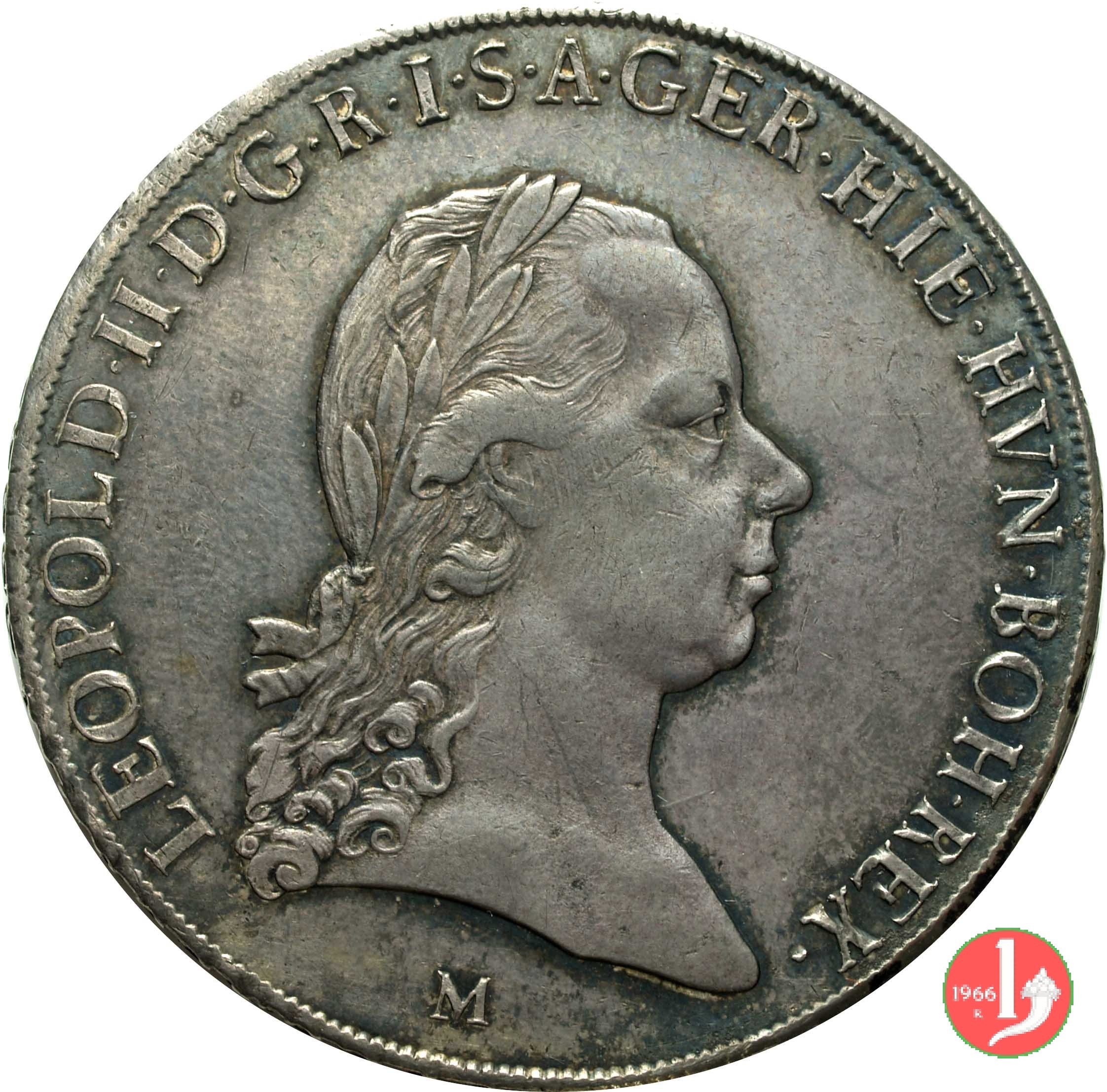 Tallero delle Corone Dritto: Testa laureata dell'Imperatore a destra, intorno LEOPOLD • II • D • G • R • I • S • A • GER • HIE • HVN • BOH • REX • All'esergo M (segno di zecca di Milano). Verso: Croce di Borgogna ornata con il Toson d'Oro. Ai lati e sopra, le tre corone reali dell'Impero: Austria, Boemia e Ungheria. Nel giro, ARCH • AVST • DVX • BVRG • LOTH • BRAB • COM • FLAN • e il millesimo. | |