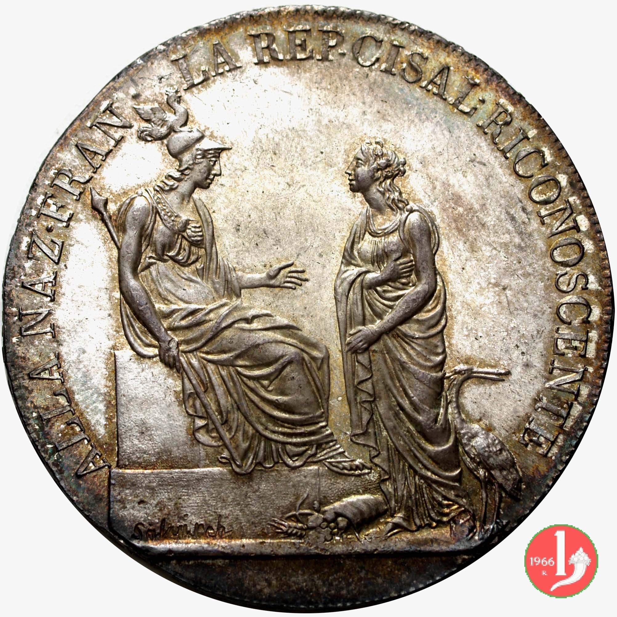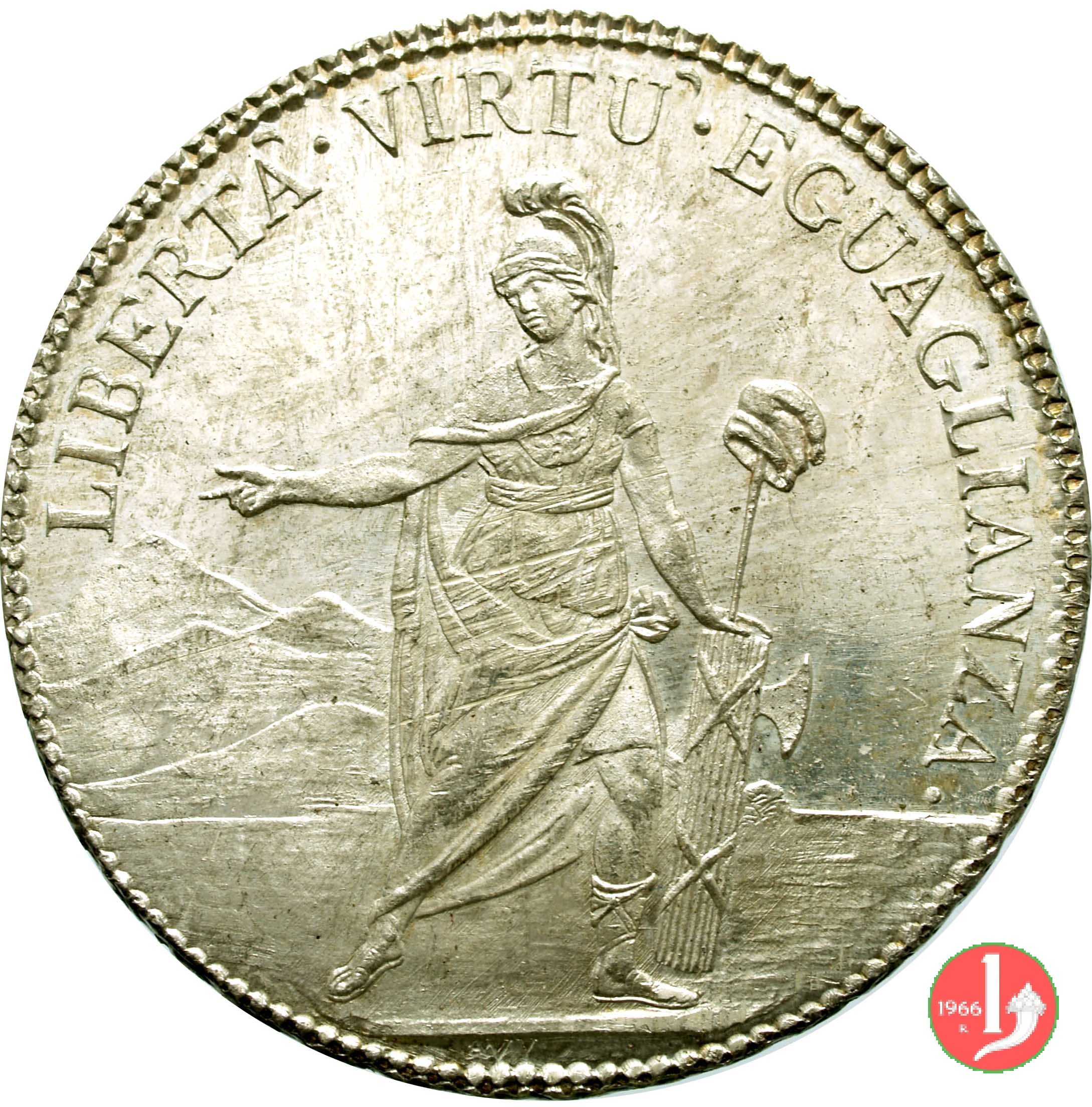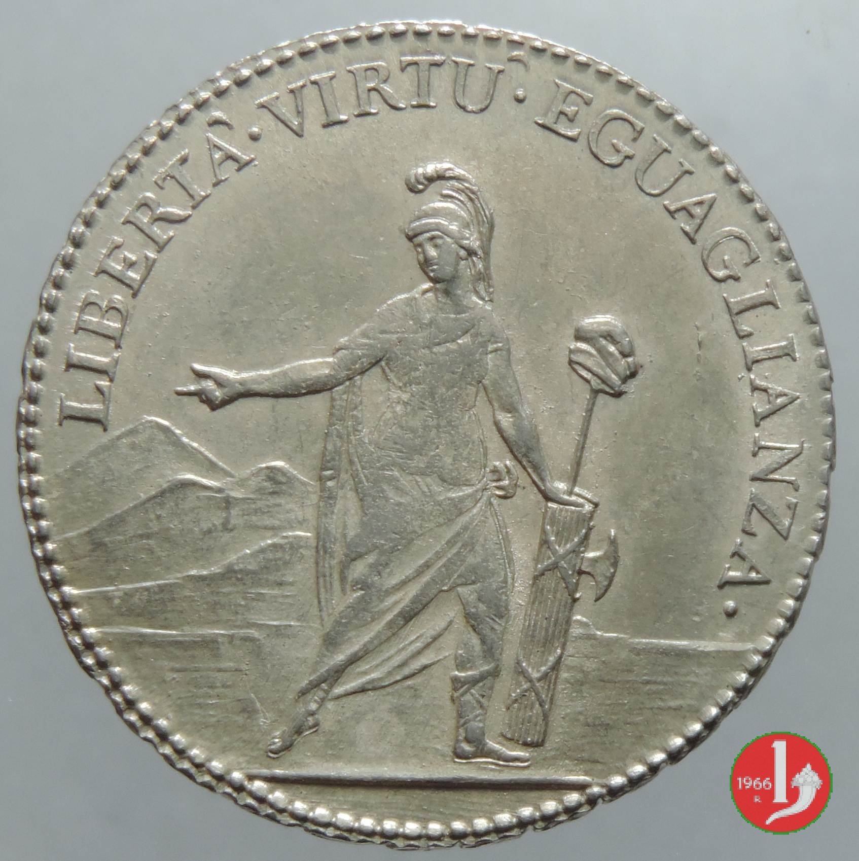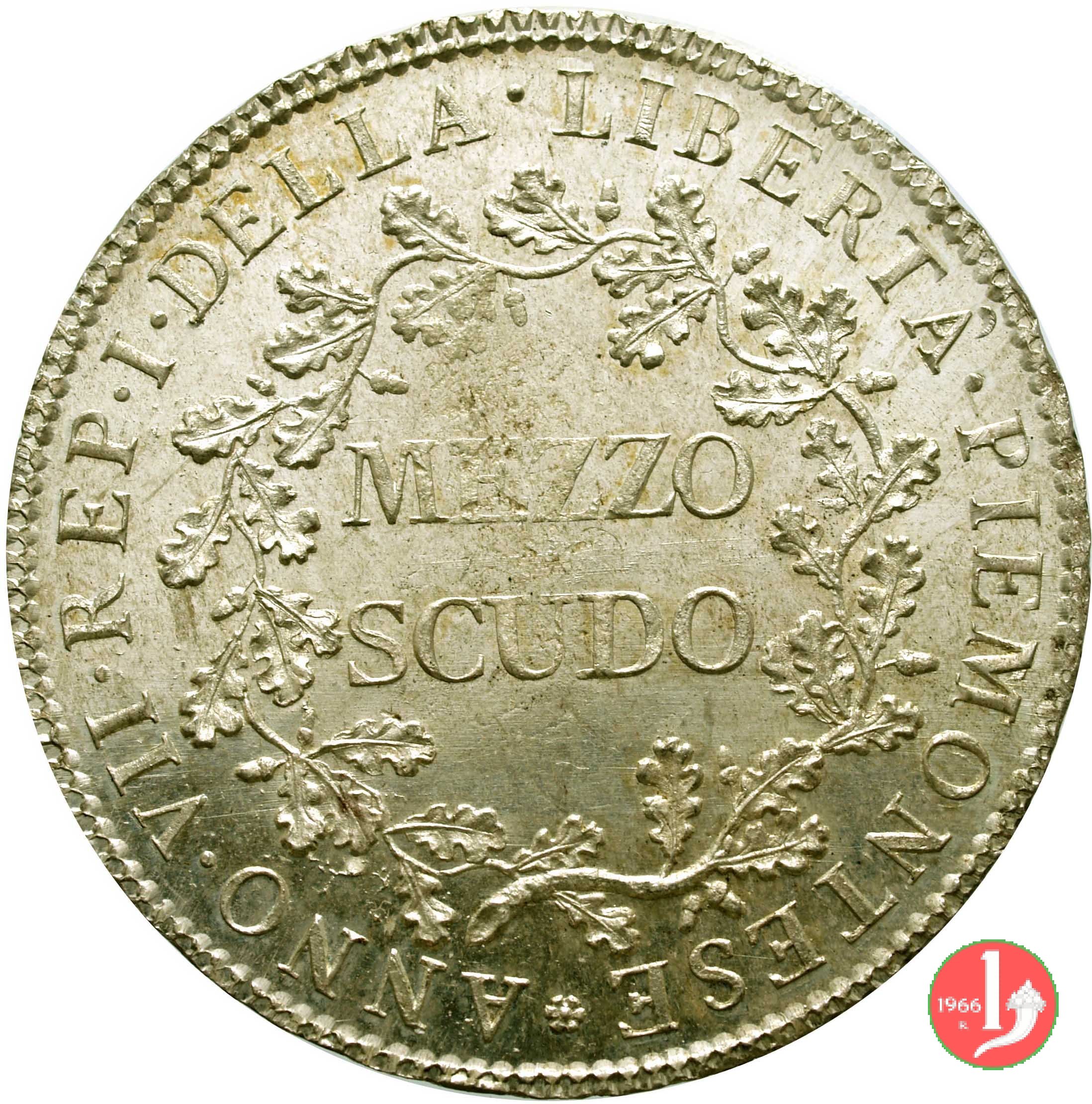 Mezzo Scudo Dritto: ANNO • VII • REP • I • DELLA • LIBERTÀ • PIEMONTESE e una rosetta a sei petali. Nel campo tra rami di quercia, su due righe MEZZO / SCUDO (indicazione del valore). Verso: LIBERTÀ • VIRTÚ • EGUAGLIANZA •, figura allegorica della Gallia Subalpina con fascio con scure e e pileo, sullo sfondo il Monviso. CNI 4. Pagani 1/a/b. | |