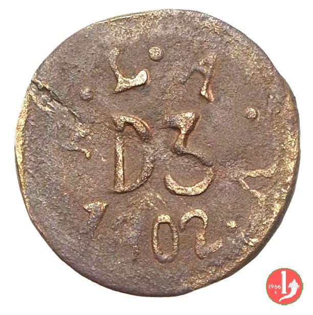 3 denari Dritto: Nel campo indicazione del valore (D • 3), intorno R • L • A • V • 1802 • (sigla per Repubblica Ligure Anno V 1802). Verso: Croce nel campo | |