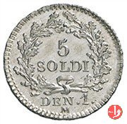 5 soldi Dritto: Bilancia a due bracci sovrapposta ad un ramo di palma e spada che si incrociano legati da un nastro, intorno REPUBBLICA ITALIANA. In basso indicazione del millesimo (1804 • III). Verso: Indicazione del valore su 2 righe (10 SOLDI) all'interno di due rami di quercia incrociati e legati con un nastro. In esergo indicazione del valore (DEN • 1 •) sotto al quale si trova il segno di zecca (M). | |