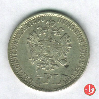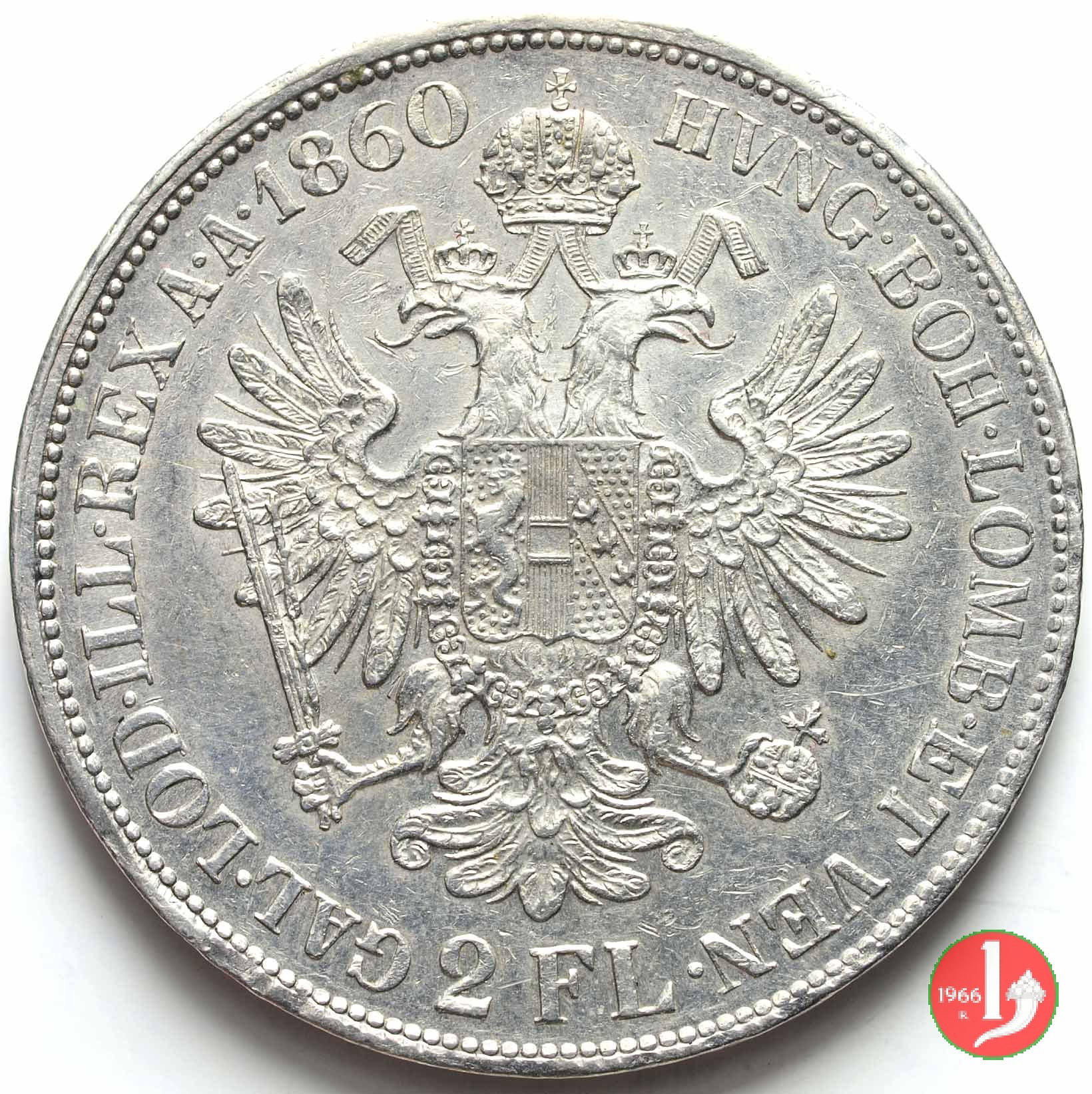 2 Fiorini Dritto: FRANC. IOS. I. D. G. AVSTRIAE IMPERATOR Testa laureata a destra, sotto al collo V (segno di zecca per Venezia) Verso: HVNG. BOH. LOMB. ET VEN. - GAL. LOD. ILL. REX A. A. 1860 aquila bicipite, ad ali spiegate, sormontata da corona imperiale e con lo scudo austriaco al centro. In basso 2 FL (valore) | |