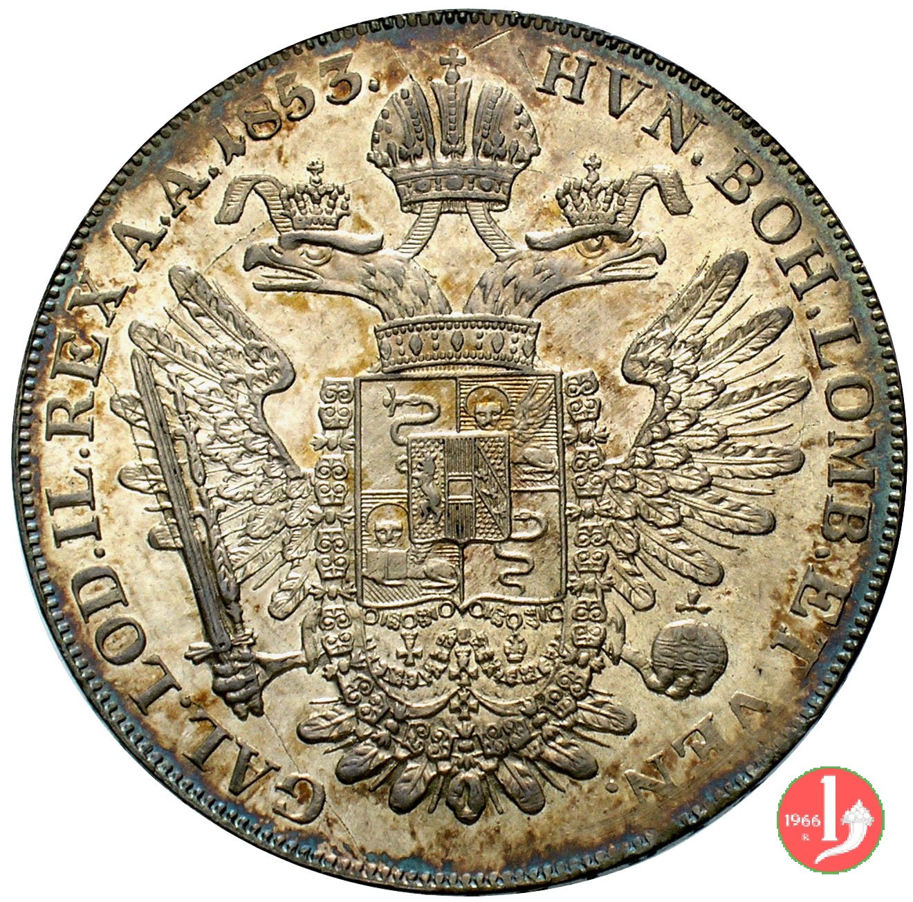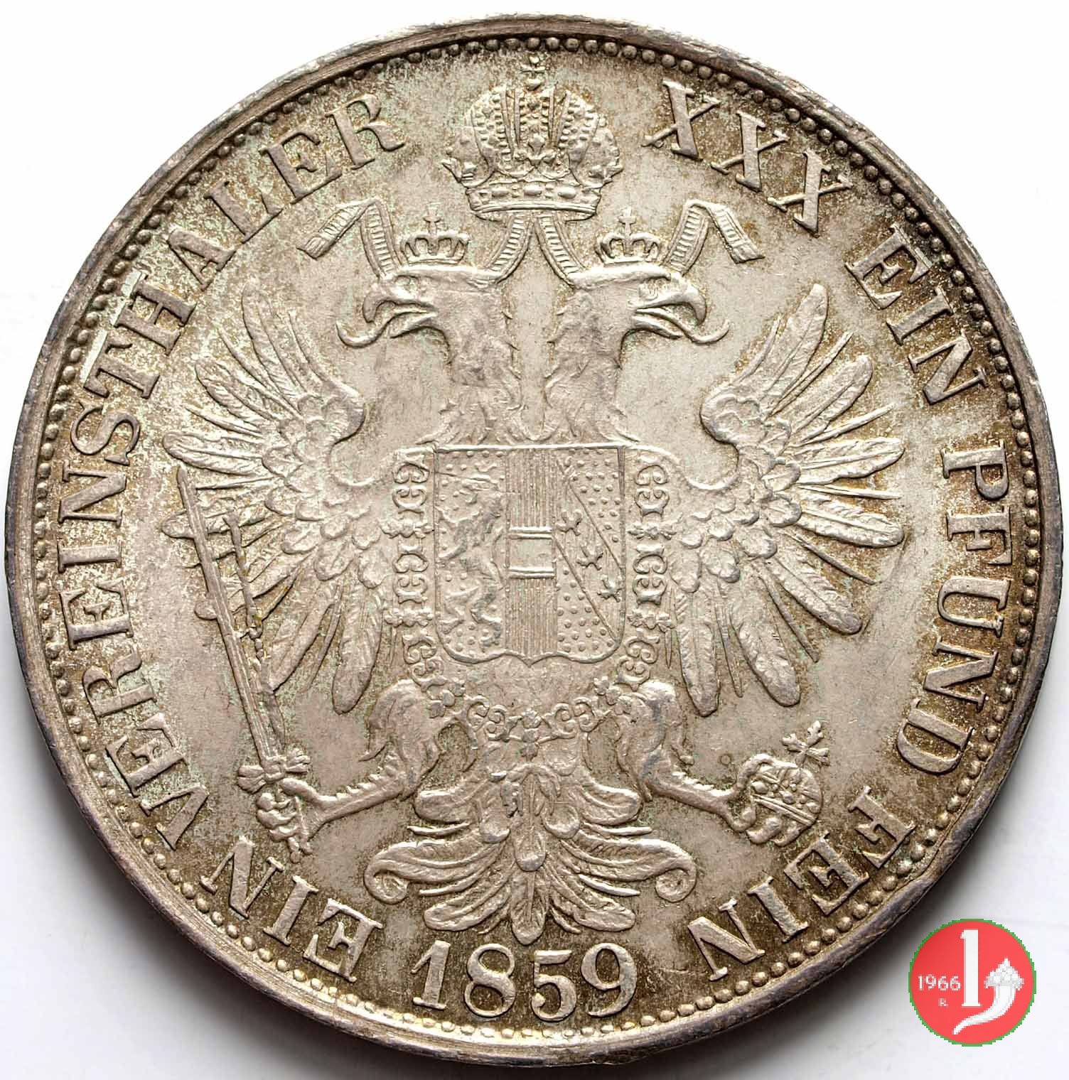 Tallero Dritto: Testa laureata a destra. Intorno FRANZ JOSEPH I V. G. G. KAISER V. OESTERREICH. Sotto segno di zecca (M per Milano, V per Venezia). Verso: Aquila bicipite sormontata da corona imperiale e con lo scudo austriaco. Intorno EIN VEREINSTHALER XXX EIN PFUND FEIN. Sotto data. | |