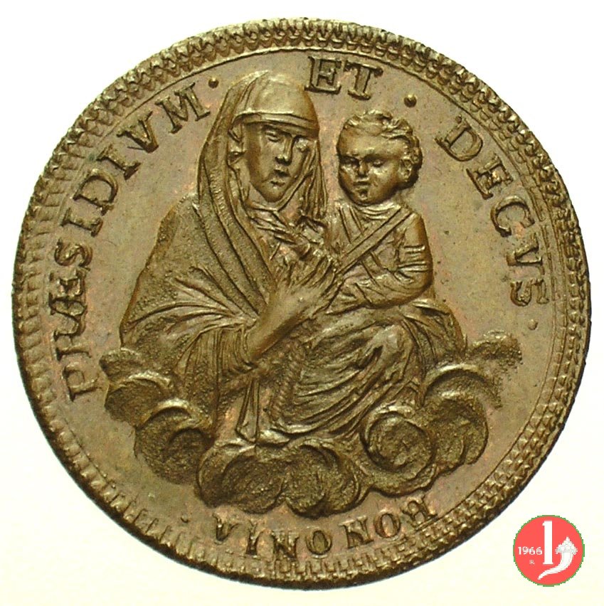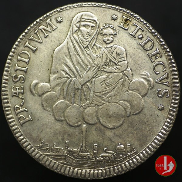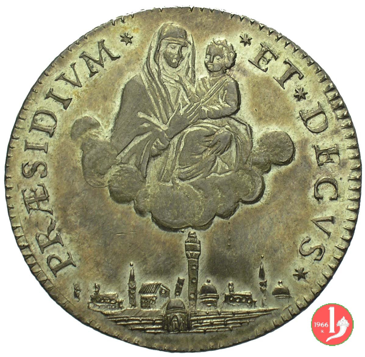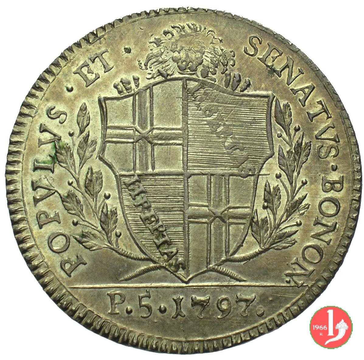 1/2 scudo Dritto: Stemma semiovale della città di Bologna (inquartato con croce nel primo e terzo quarto e motto LIBERTAS nel secondo e terzo) tra rami di lauro e sormontato da testa e zampe leonine. Intorno POPVLVS • ET • SENATVS • BONON •. In esergo, indicazione del valore (P • 5 •), millesimo e •. Verso: Beata Vergine con bambin Gesú su nubi sovrastanti una veduta della città di Bologna. Intorno PRAESIDIVM • • ET • DECVS •. | |