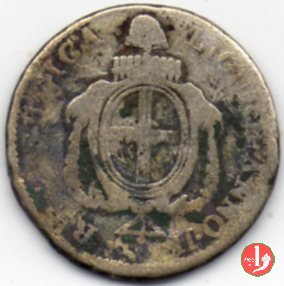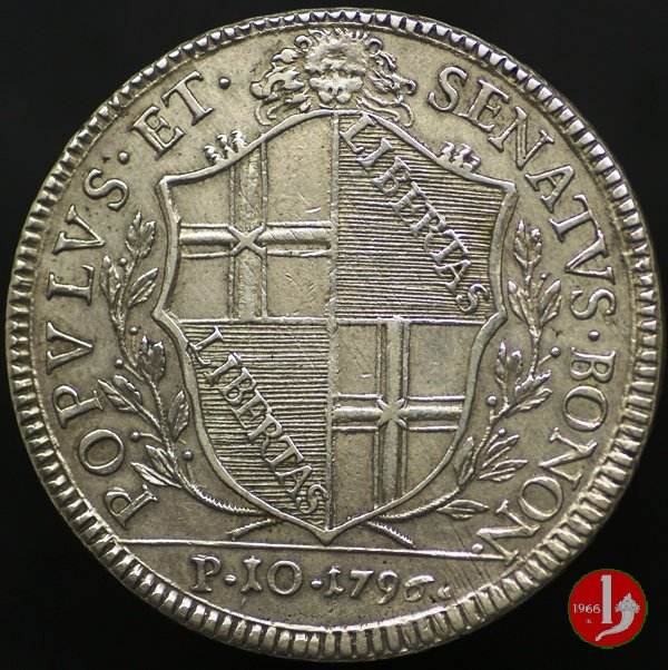 2 carlini Dritto: Stemma della città di Bologna (inquartato con croce nel primo e terzo quarto e motto LIBERTAS nel secondo e terzo) sormontato da testa leonina. Intorno COMVNITAS • ET • SENATVS • BONON • Verso: Indicazione del valore (DVE / CARLINI / BOLOGNE / SI) su quattro righe tra rami di lauro. | |