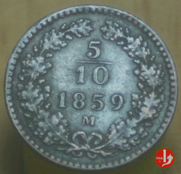 5/10 Kreuzer Dritto: Aquila bicipite dell'Impero Austriaco sormontata da corona imperiale e caricata con stemma austriaco. Intorno K • K • OESTERREICHISCHE SCHEIDEMÜNZE. Verso: Corona formata da due rami di quercia incrociati e legati da un nastro in basso. All'interno della corona indicazione del valore (5/10), millesimo e segno di zecca (V per Venezia e M per Milano) su tre righe. | |