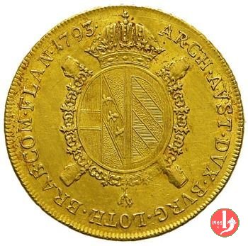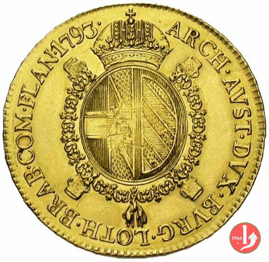 1/2 sovrano Dritto: Stemma ovale degli Asburgo-Lorena sormontato da corona imperiale e ornato dal collare del Toson d'Oro. Intorno, ARCH • AVST • DVX • BVRG • LOTH • BRAB • COM • FLAN • e il millesimo (1793). Verso: Testa dell'Imperatore con corona di alloro a destra, intorno FRANC • II • D • G • R • IMP • S • A • GE • HIE • HV • BO • REX •. In esergo il segno di zecca (M). | |