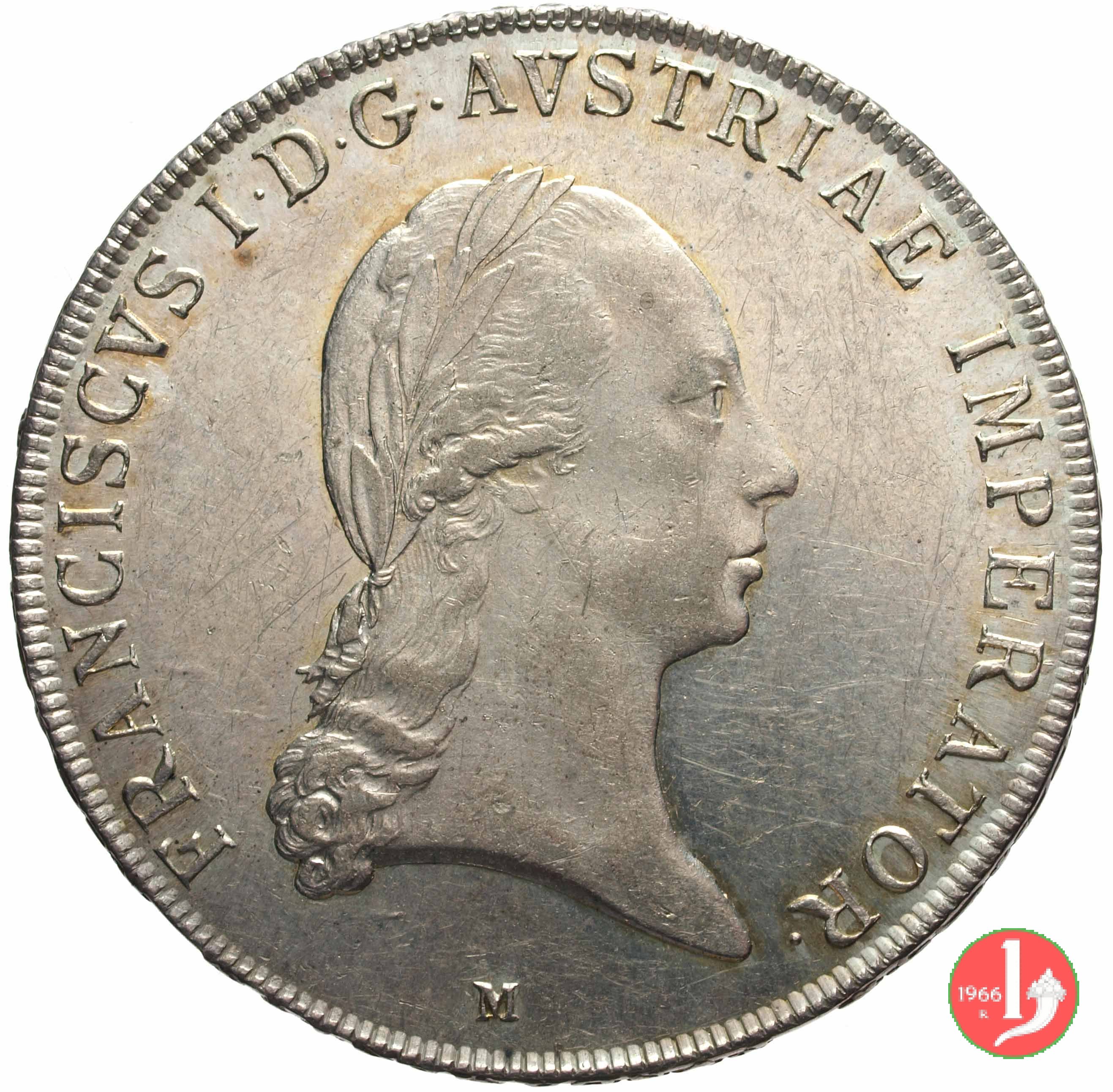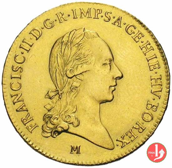 1 sovrano Dritto: Stemma ovale degli Asburgo-Lorena sormontato da corona imperiale e ornato dal collare del Toson d'Oro. Intorno, ARCH • AVST • DVX • BVRG • LOTH • BRAB • COM • FLAN • e il millesimo. Verso: Testa dell'Imperatore con corona di alloro a destra, intorno FRANCISC • II • D • G • R • IMP • S • A • GE • HIE • HV • BO • REX •. In esergo il segno di zecca (M). | |