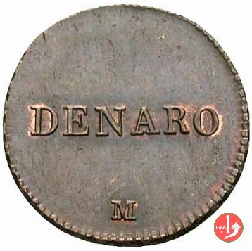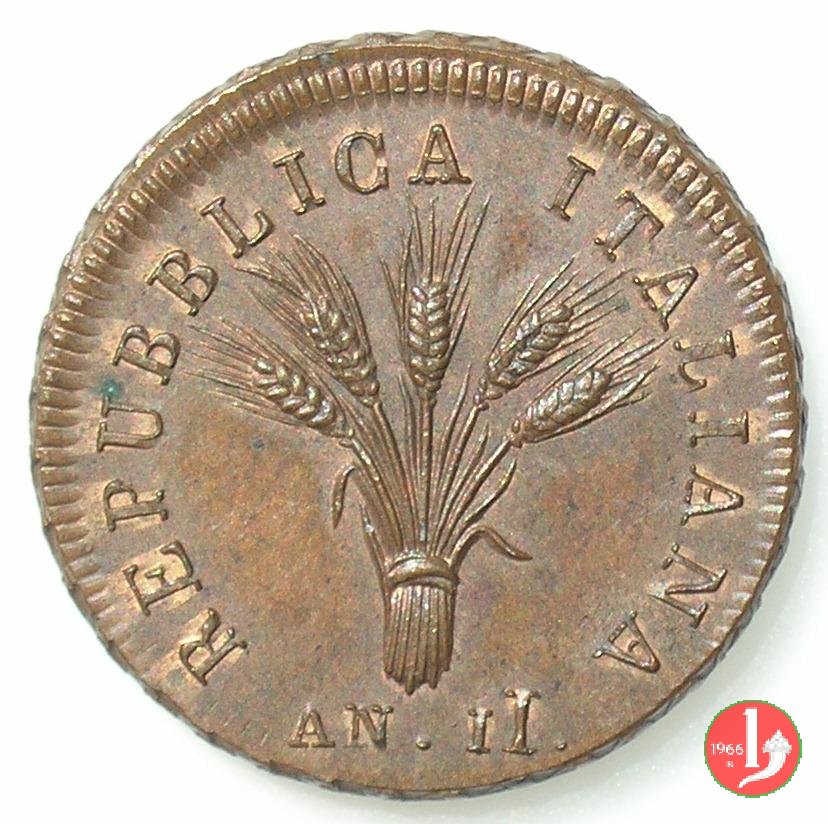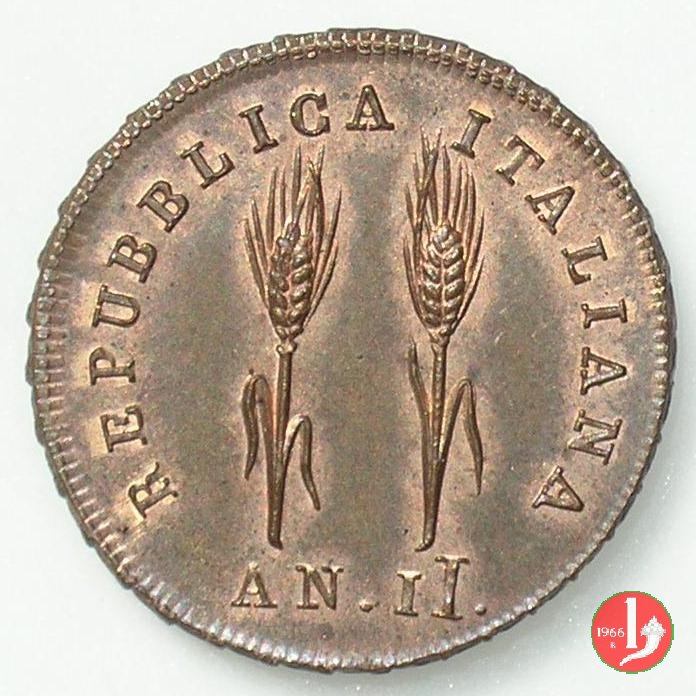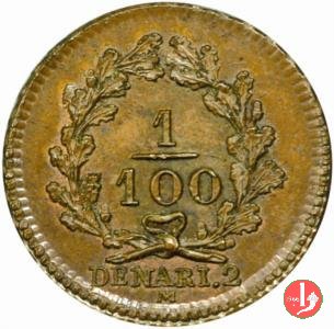 1 centesimo Dritto: Bilancia a due bracci sovrapposta ad un ramo di palma e spada che si incrociano legati da un nastro, intorno REPUBBLICA ITALIANA. In basso indicazione del millesimo (1804 • III •). Verso: Indicazione del valore (CEN TESIMO su due righe oppure 1/100) all'interno di due rami di quercia incrociati e legati con un nastro. In esergo indicazione del valore (DENARI • 2) sotto al quale si trova il segno di zecca (M). | |