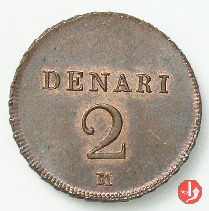 2 denari Dritto: Due spighe di grano affiancate. Intorno REPUBBLICA ITALIANA, in esergo indicazione del millesimo (AN • II •). Verso: Indicazione del valore (DENARI 2) su due righe. In basso segno di zecca (M). | |