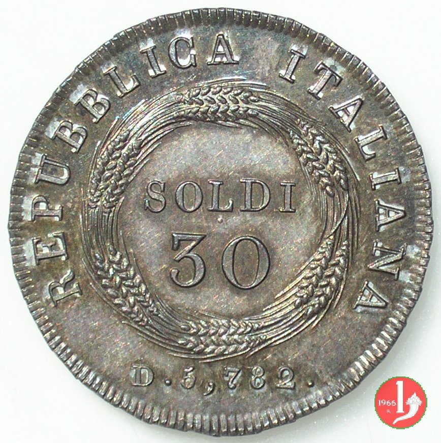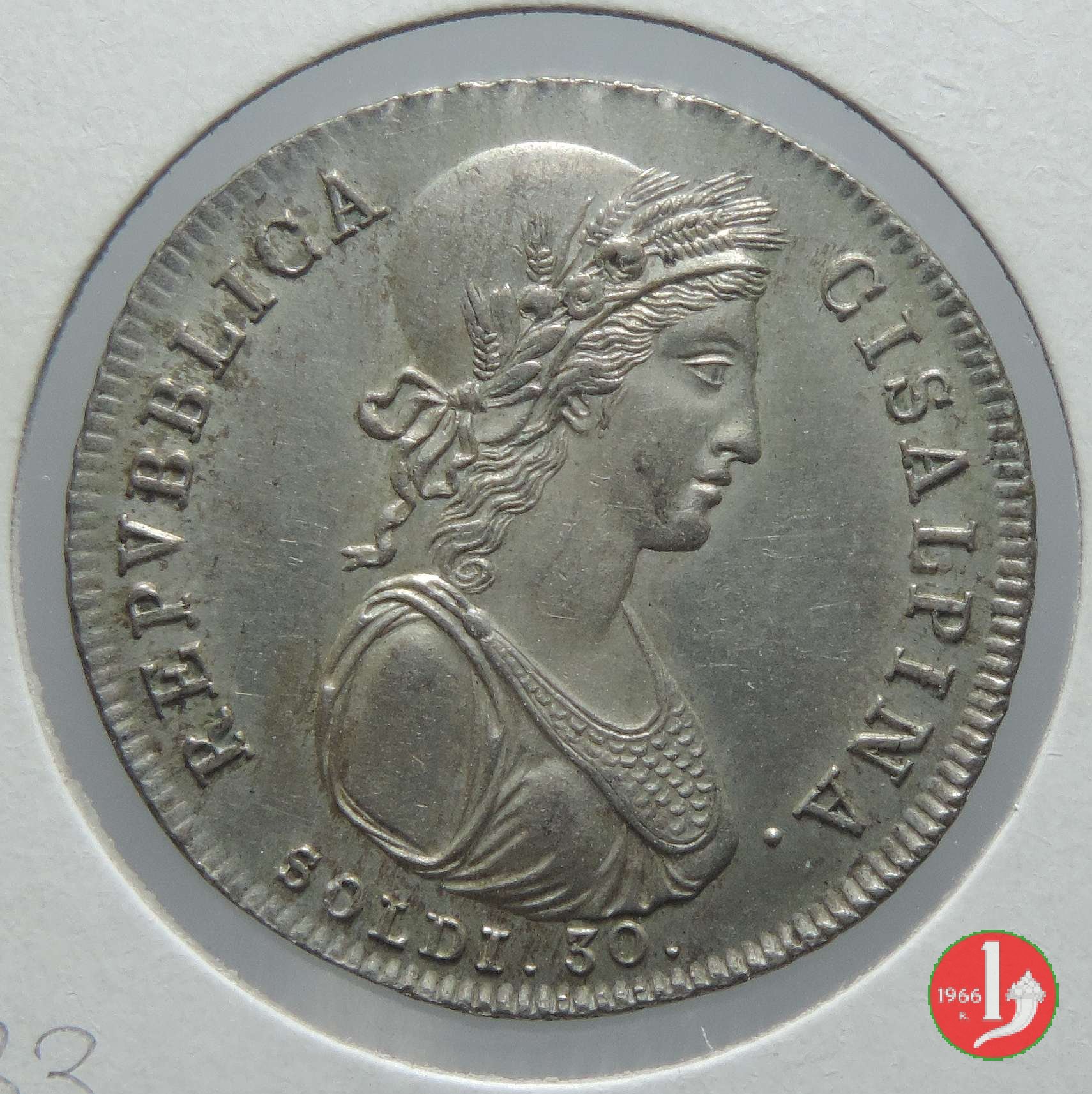 30 soldi Dritto: PACE / CELEBRATA • / FORO BONAPARTE FONDATO • / ANNO IX • su cinque righe. Verso: Allegoria muliebre della Repubblica Cisalpina, con busto paludato volto a destra con elmo ornato da una fascia con spighe e fiori. Intorno REPVBBLICA CISALPINA • e, in basso, l'indicazione del valore (SOLDI • 30 •). | |