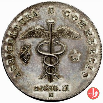 5 francs Dritto: Allegoria della Francia e della Gallia Subalpina. La Francia (figura a destra) regge con la mano un'asta sormontata da berretto frigio e con la sinistra un archipendolo, strumento utilizzato per il puntamento dell'artiglieria. Intorno la scritta GAULE / SUBALPINE. Sul basamento dell'esergo LAVY (nome dell'incisore) Verso: LIBERTÉ, EGALITÉ e ERIDANIA separate da due rosette a sei petali. Nel campo 5 • - FRANCS su due righe e sotto la data (AN 9 • oppure AN 10 •) e cuore (simbolo del direttore di zecca Modesto Paroletti) tra due rami di alloro e palma salienti incrociati e legati alla base. | |