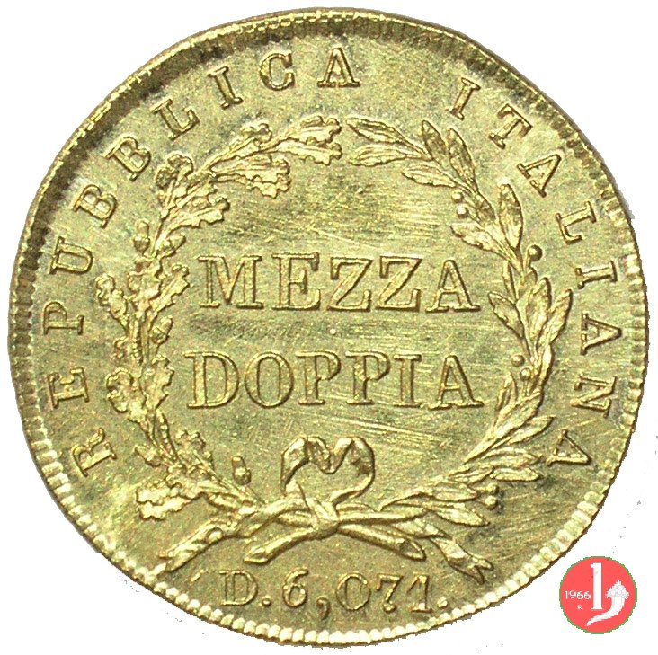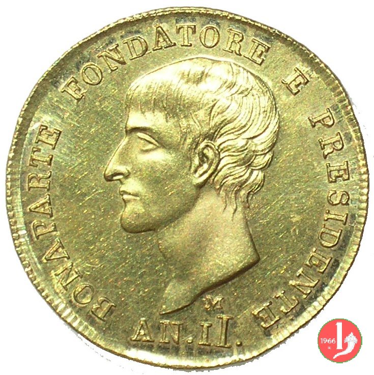 mezza doppia Dritto: Testa nuda a sinistra, nel giro BONAPARTE FONDATORE E PRESIDENTE. Sotto al taglio del collo M (Milano), in basso AN • II • Verso: Trabdue rami di quercia e lauro incrociati e legati alla base con nastro, su due righe, MEZZA / DOPPIA nel giro REPUBBLICA ITALIANA, All'esergo D • 6,071 (indicazione del peso). | |