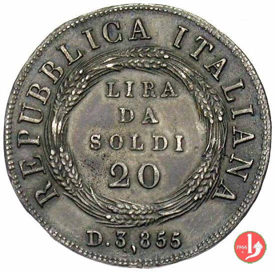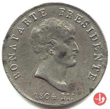 scudo Dritto: Bilancia a due bracci sovrapposta ad un ramo di palma e spada che si incrociano legati da un nastro, intorno REPUBBLICA ITALIANA. In basso indicazione del millesimo (1804 • III). Verso: Indicazione del valore su 2 righe (5 LIRE) all'interno di due rami di quercia incrociati e legati con un nastro. In esergo indicazione del valore (DENARI • 20 •) sotto al quale si trova il segno di zecca (M). | |