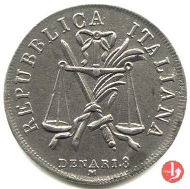 31 lire Dritto: Testa di Napoleone a destra, intorno BONAPARTE PRESIDENTE. In esergo indicazione del millesimo (1804 • III). Verso: Bilancia a due bracci sovrapposta ad un ramo di palma e spada che si incrociano legati da un nastro, intorno REPUBBLICA ITALIANA. In basso indicazione del valore (DENARI • 8 oppure DENARI • 8 •) sotto al quale si trova il segno di zecca (M). | |