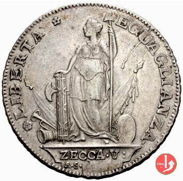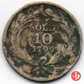 10 lire Dritto: Nel campo LIRE DIECI VENETE su tre righe tra due rosette in verticale all'interno di una corona formata da due rami di quercia. Intorno, ANNO • I • DELLA LIBERTÀ ITALIANA • 1797 e una rosetta. Verso: Figura femminile, allegoria della libertà, che regge con la sinistra una picca sormontata da berretto frigio e appoggia la destra ad un fascio con scure. In secondo piano un trionfo di armi, bandiere e strumenti musicali. Intorno, le parole LIBERTÀ (tra due rosette) e EGUAGLIANZA •. In esergo, ZECCA • V: e, piú sotto, l'indicazione dell'autore (A • S • per Antonio Schabel). | |