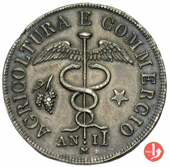 doppia Dritto: Testa nuda a sinistra, intorno BONAPARTE FONDATORE E PRESIDENTE. In esergo il millesimo (AN • II •), sotto il taglio del collo -solo nel I tipo- segno di zecca (M). Verso: Indicazione del valore (DOPPIA), circondato due rami di quercia incrociati con nastro (I tipo) oppure da un serpente che si morde la coda (II tipo). Intorno REPUBBLICA ITALIANA, in esergo indicazione del peso (D • 12,142). | |