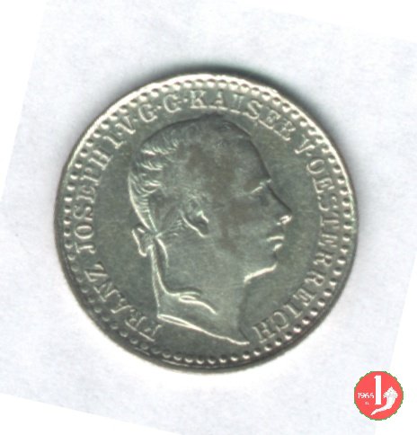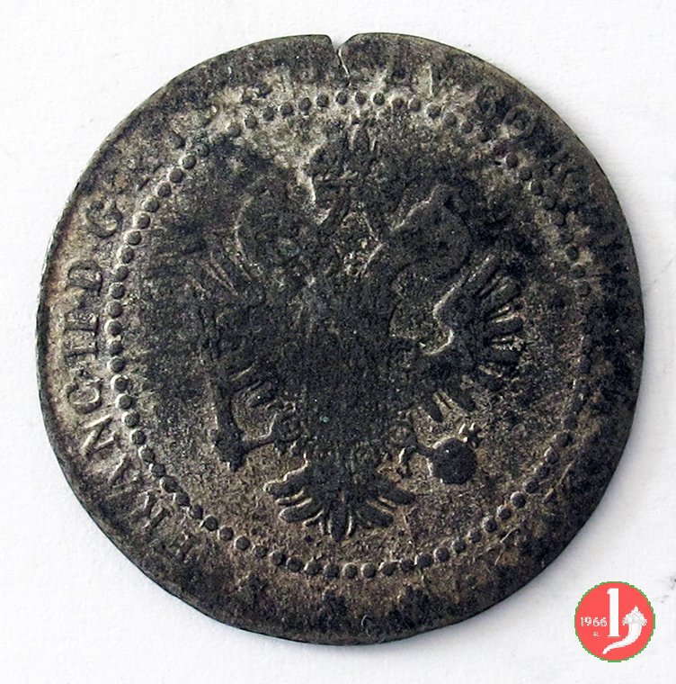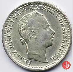 5 Kreuzer Dritto: Testa laureata dell'Imperatore volta a destra. Intorno, FRANZ JOSEPH I • V • G • G • KAISER V • OESTERREICH. Verso: Dall'alto verso il basso su 4 righe: corona imperiale, indicazione del valore (5), millesimo e segno di zecca (M per Milano e V per Venezia). Lungo il bordo nella parte superiore (SCHEIDE MÜNZE), nella parte inferiore semicorona composta da un ramo di lauro e uno di palma legati con un nastro. | |