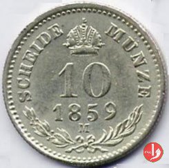 10 Kreuzer Dritto: Testa laureata dell'Imperatore volta a destra. Intorno, FRANZ JOSEPH I • V • G • G • KAISER V • OESTERREICH. Verso: Dall'alto verso il basso su 4 righe: corona imperiale, indicazione del valore (10), millesimo e segno di zecca (M per Milano e V per Venezia). Lungo il bordo nella parte superiore (SCHEIDE MÜNZE), nella parte inferiore semicorona composta da un ramo di lauro e uno di palma legati con un nastro. | |